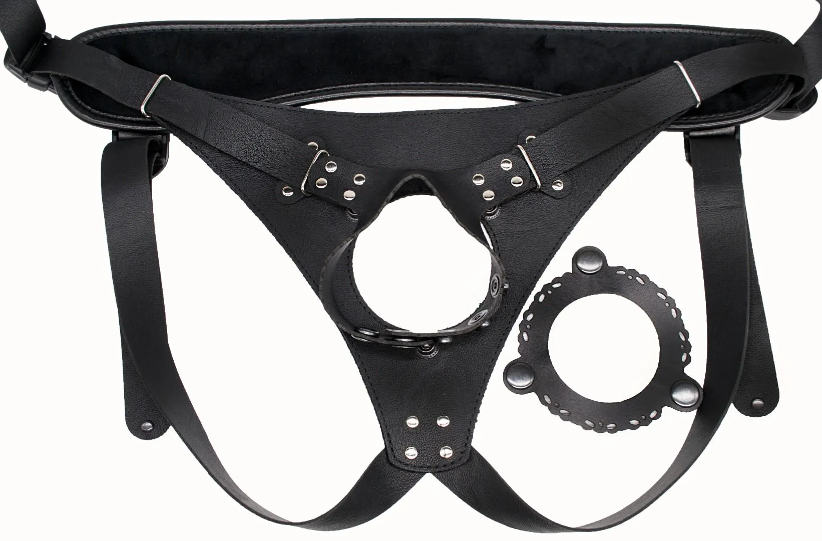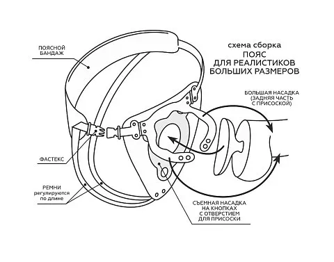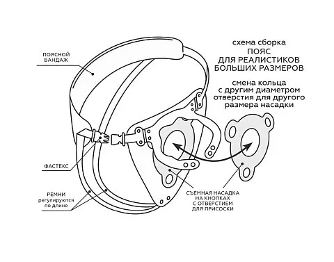 Пояс способен выдержать самый «солидный» размер насадки. Для этого проденьте насадку с присоской в отверстие. Присоска, соприкасаясь с телом, способна амортизировать нагрузки и даже присасываться к телу, дополнительно фиксируя изделие. В зависимости от размера снимите или оставьте съемное кольцо. И отрегулируйте «хомутик» с помощью кнопок для изменения диаметра по насадке-реалистику. Такой пояс можно использовать в очень широком диапазоне размеров.