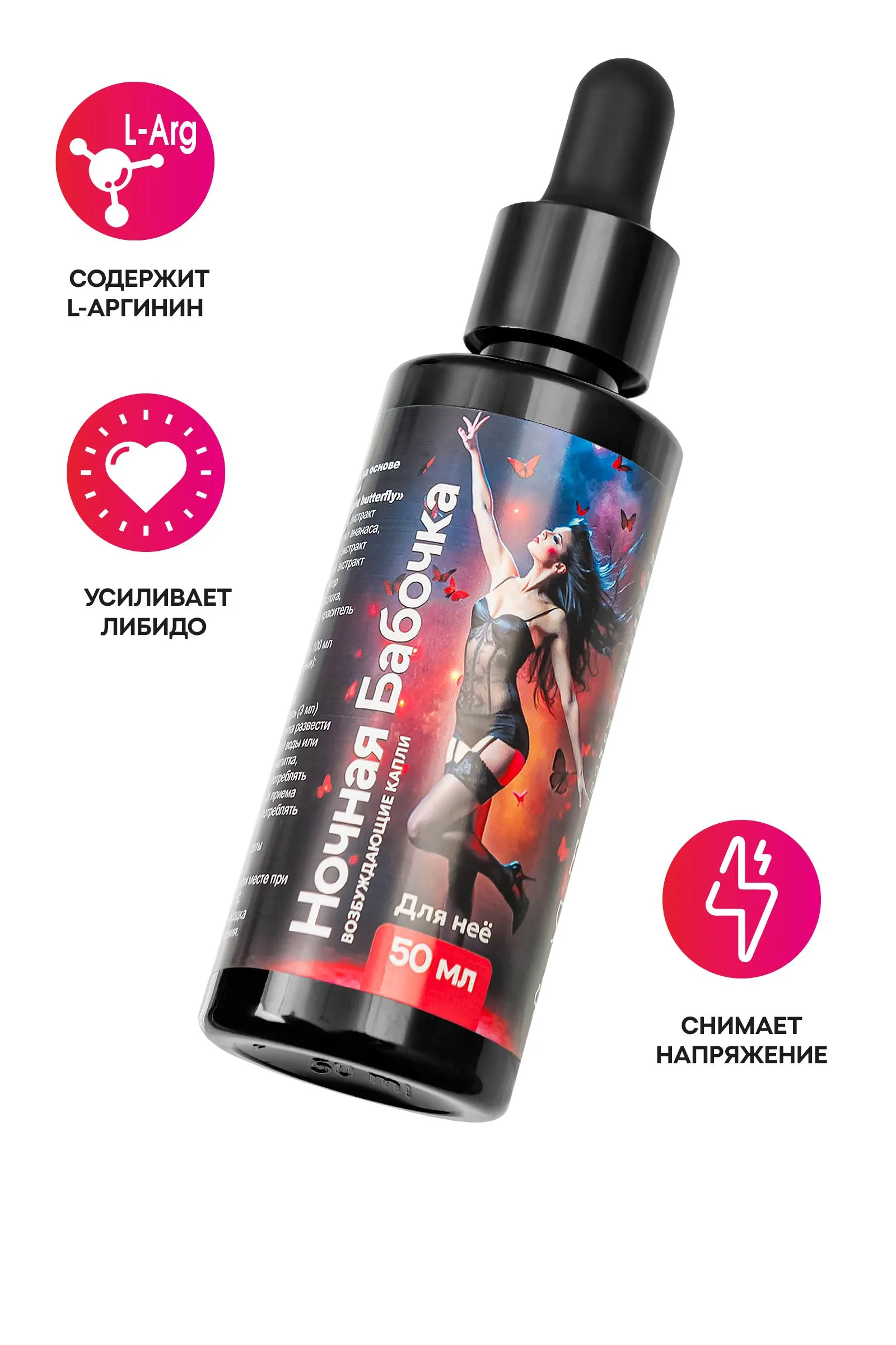 Откройте для себя новые грани наслаждения с возбуждающими каплями для женщин «Ночная бабочка». Этот продукт, созданный специально для повышения женского либидо, подарит вам незабываемые моменты страсти и удовольствия.