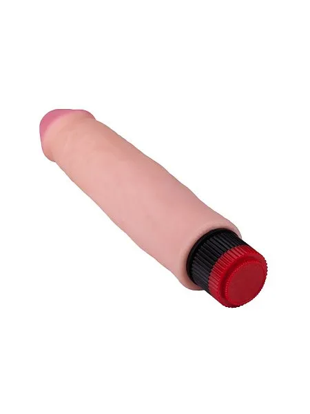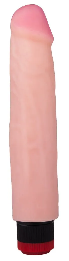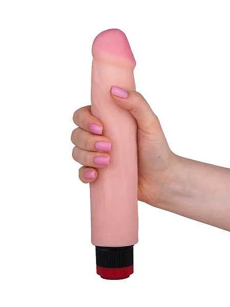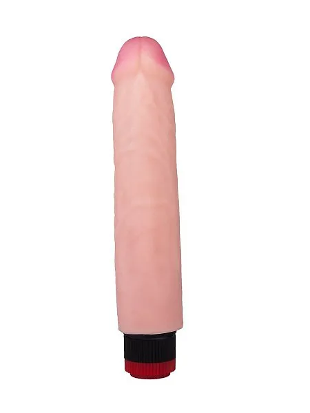 Этот вибромассажер из неоскина имеет рабочую длину 21 см и диаметр головки 4,6 см. Регулировка скорости осуществляется поворотом колесика в основании. Вибрирующий элемент расположен по всей длине. Питание: 2 батарейки типа АА.